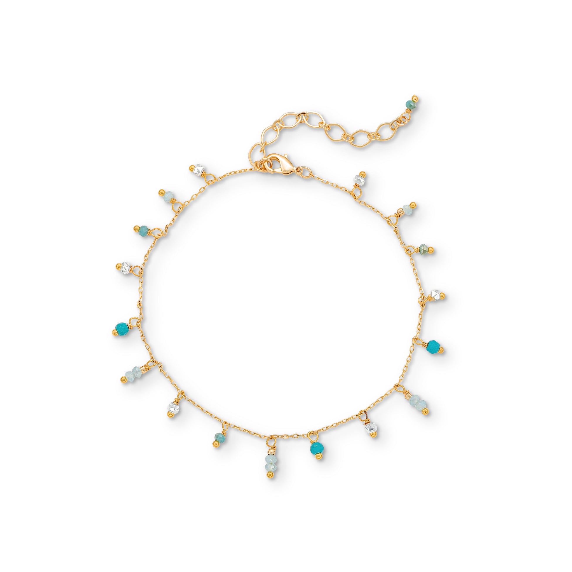 The Drift Beaded Anklet in Blue Ombre is adorned with dainty hues of blue beading. This anklet is made of high polish, 14k gold-plating with beading, and measures 9" with a 2" extender.