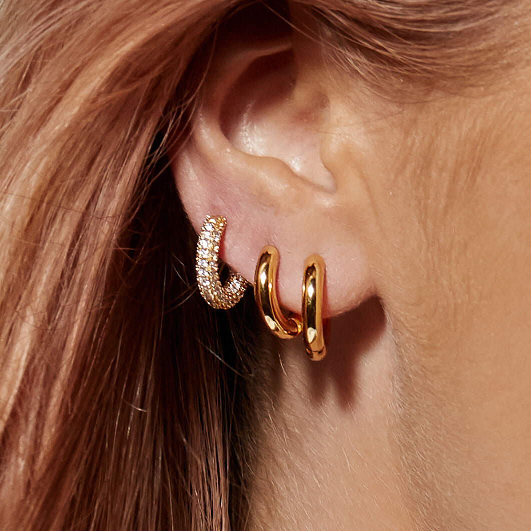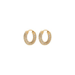 The Luv AJ Pave Amalfi Huggies are high polish 14k gold plated earrings that are 0.55" long. These small circular pieces are surrounded by dazzling crystal pave.
