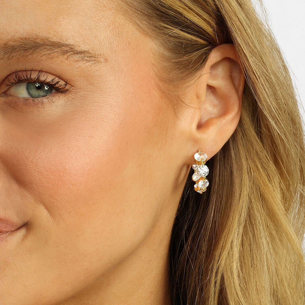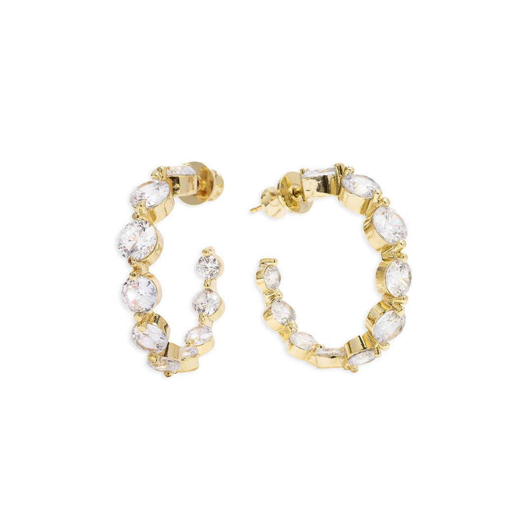 Melinda Maria's She's an Icon Hoops add elegance to any look with an array of bezel-set crystals. These earrings are made of high polish, 18k gold-plating with crystals, and measure .75".