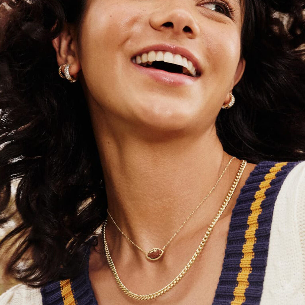 Kendra Scott's signature pendant style in a football shape? Touchdown! The Football Gold Short Pendant Necklace in Orange Goldstone is the perfect way to put the “game” in your game day look. Layer with your favorite chain or wear as a standalone necklace—either way, you’ll be the most stylish fan in the stands.