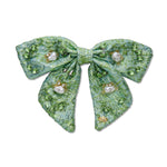 This bow brings vintage romance with a touch of shimmer. Green jacquard, baroque faux pearls, and crystal accents create a statement that’s equal parts playful and polished.