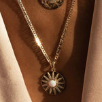 A dreamy pendant with celestial shimmer, this necklace catches the light with every move. The simulated opal center radiates soft iridescence, grounded by warm gold tones.