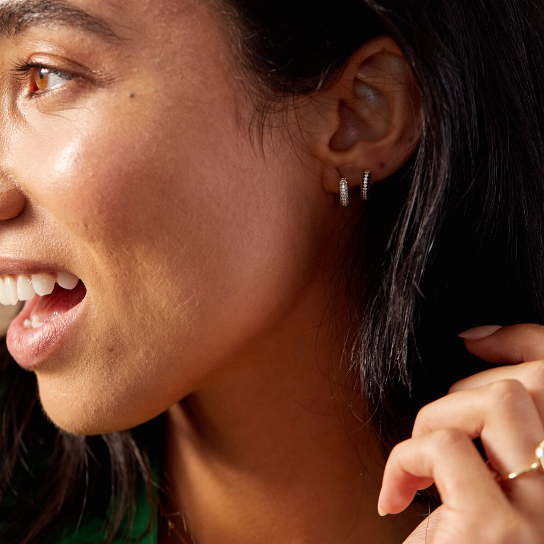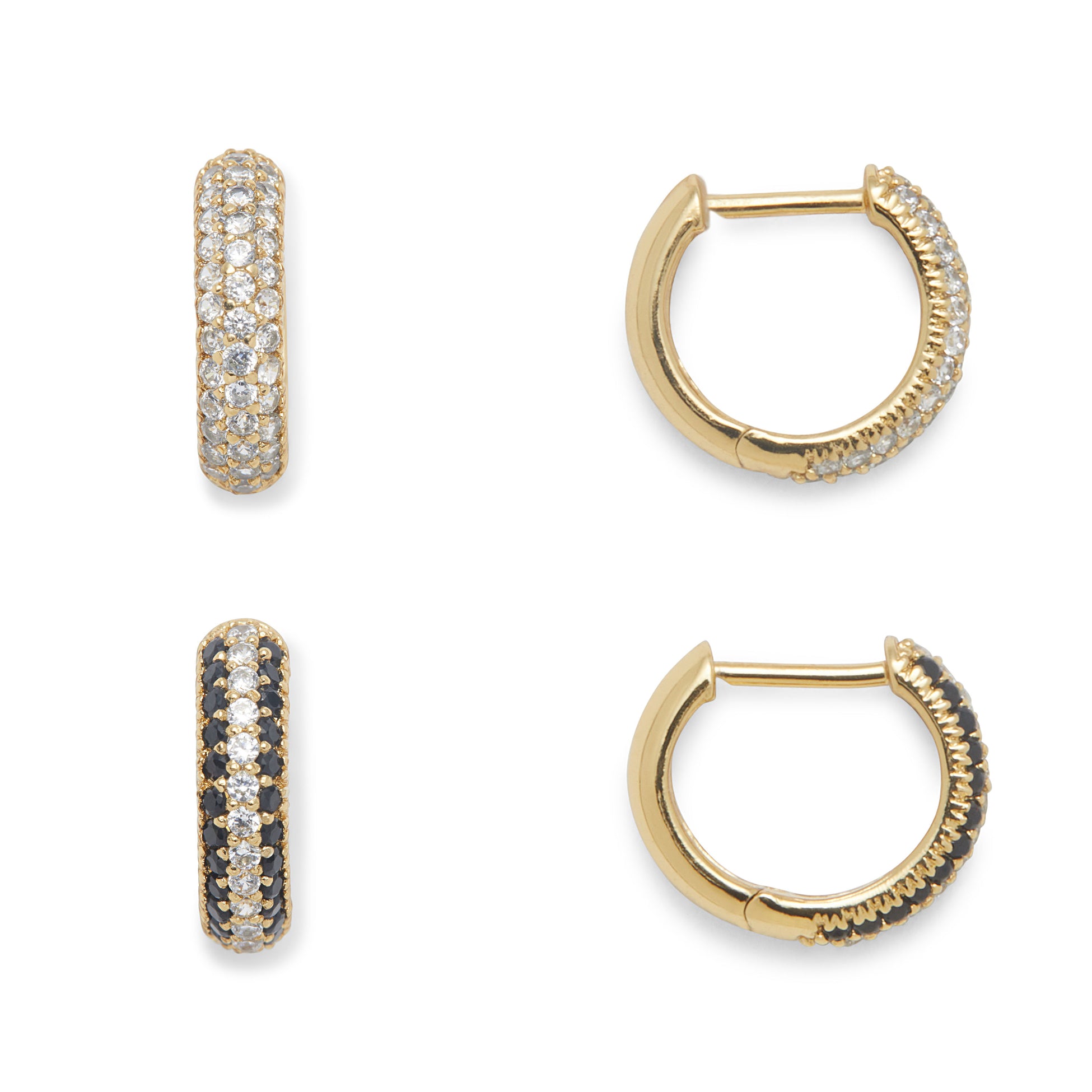 The Rocksbox Sonoma Huggie Pack features 14k gold plated earrings that are 10 mm in diameter. This set is composed of charming small hoops in two colors - black and white crystal pave.