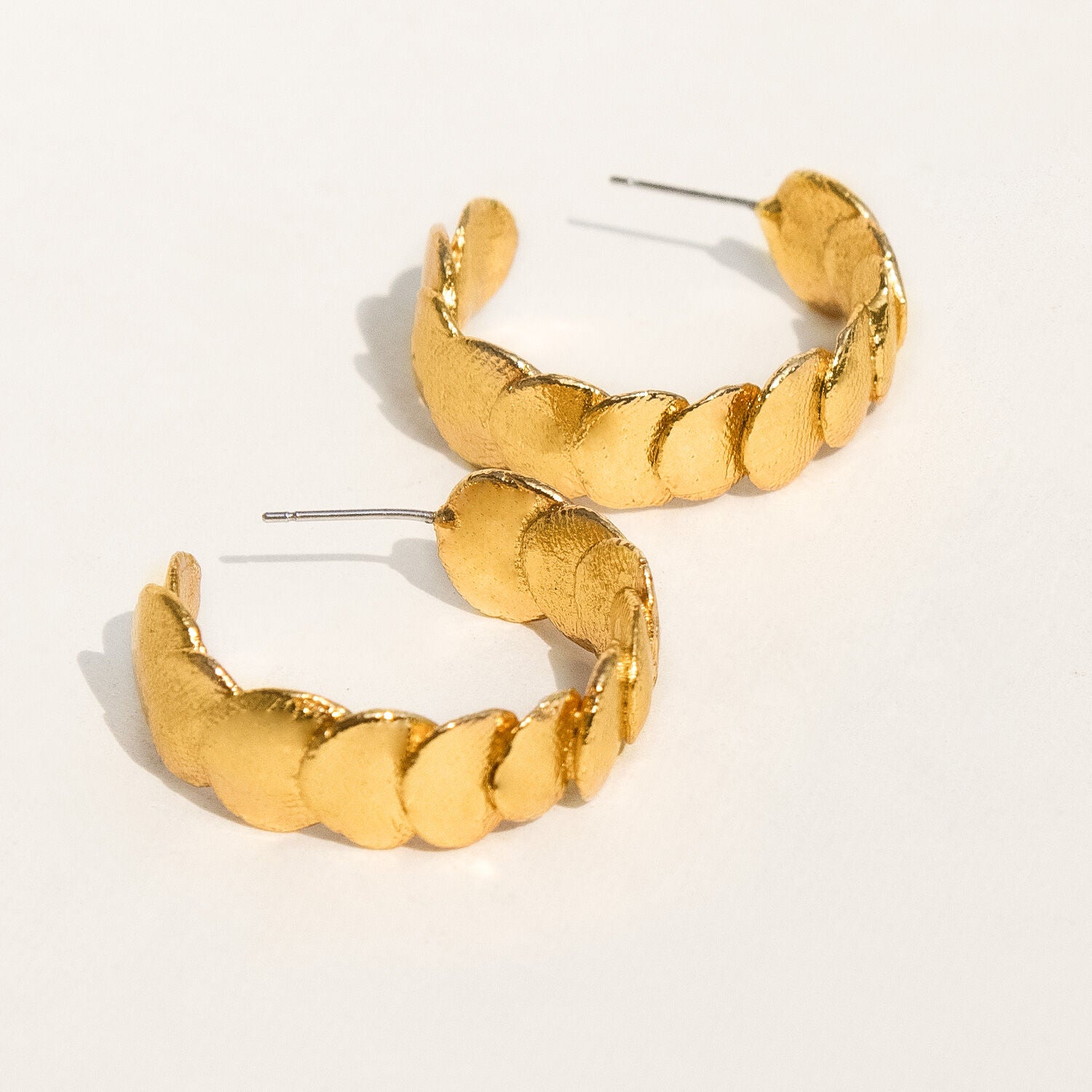 The Chantal Hoops by Pajarolimon are a great alternative to your everyday hoops featuring a textured scalloped design. Made with 24k gold plating over recycled bronze. Handcrafted by artisans in Columbia.