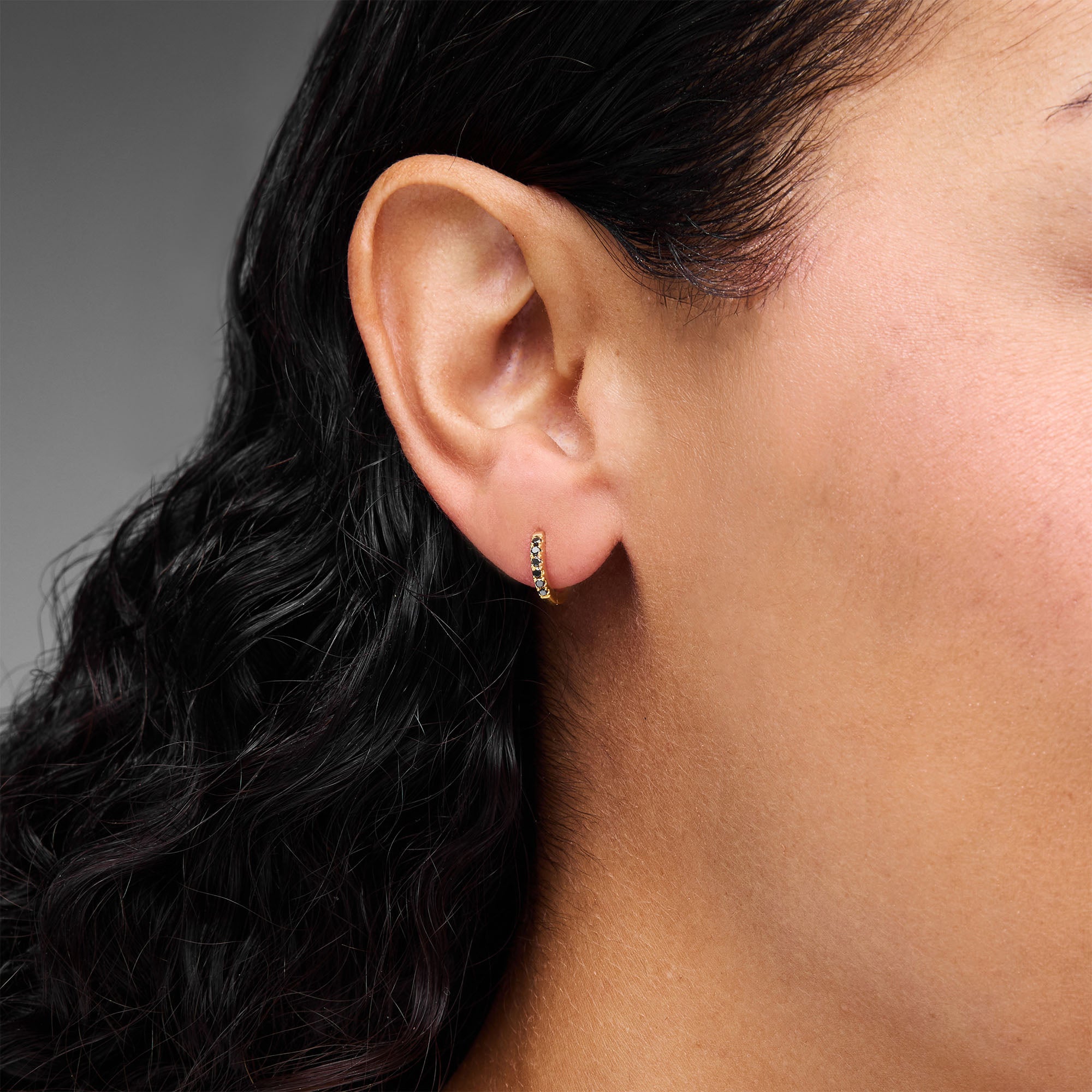 Quiet drama. These minimalist huggies are set with black diamonds for a moody, modern edge.