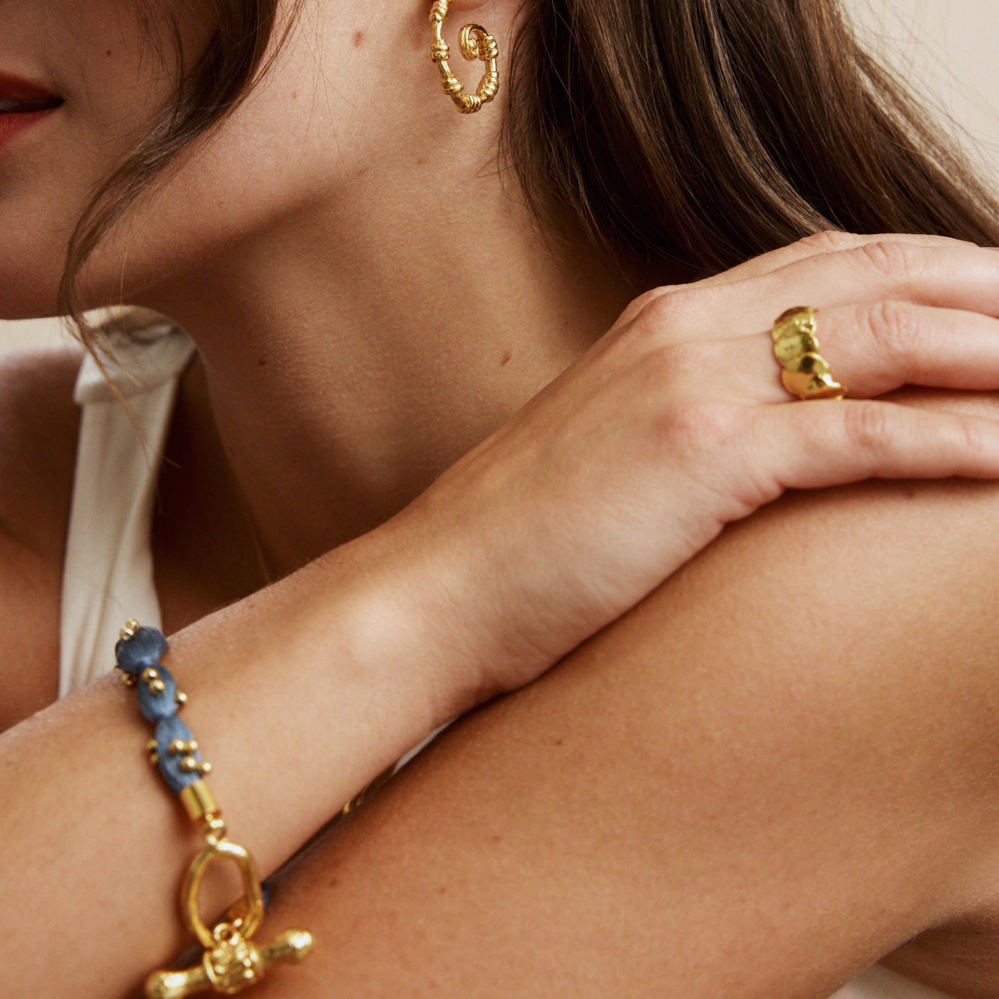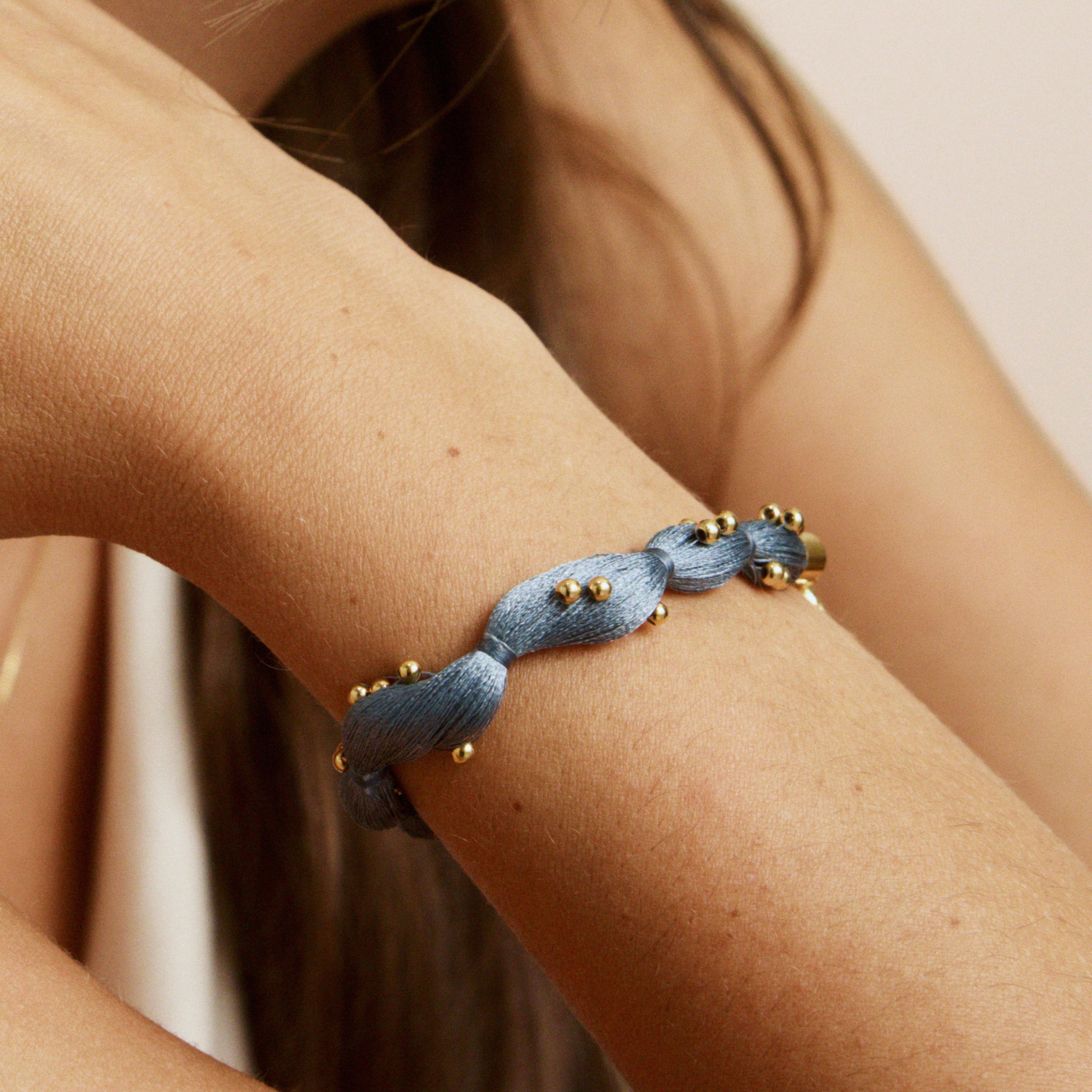 The Thea Bracelet by Pajarolimon in Atlantic blue features intricately woven thread with gold detailing. Made with 24k gold plating over recycled bronze. Handcrafted by artisans in Columbia.