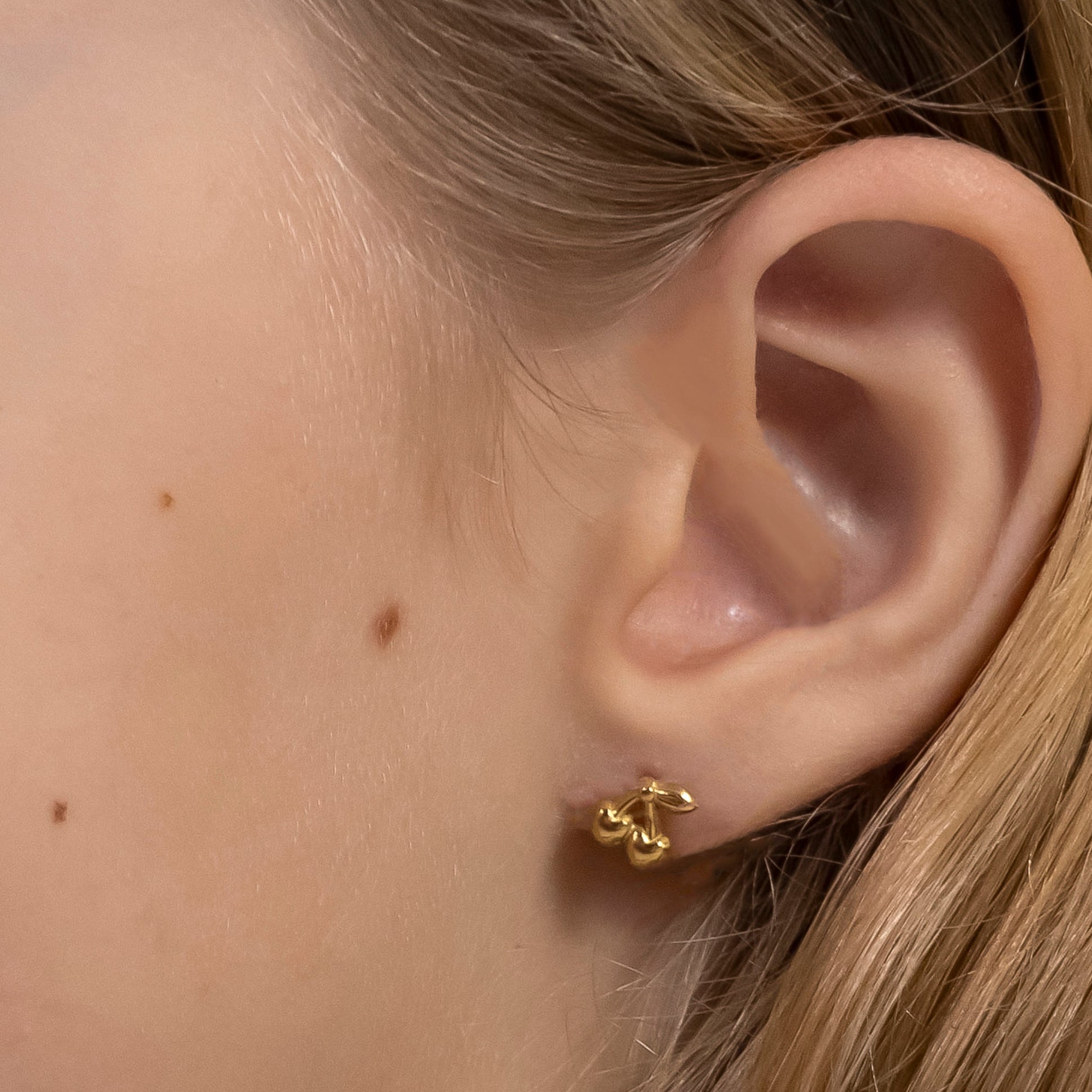 Sweet and subtle, these flat-back cherry studs bring a touch of whimsy to your ear party. Finished in 14k gold plating, they’re comfortable enough to wear all day, every day.