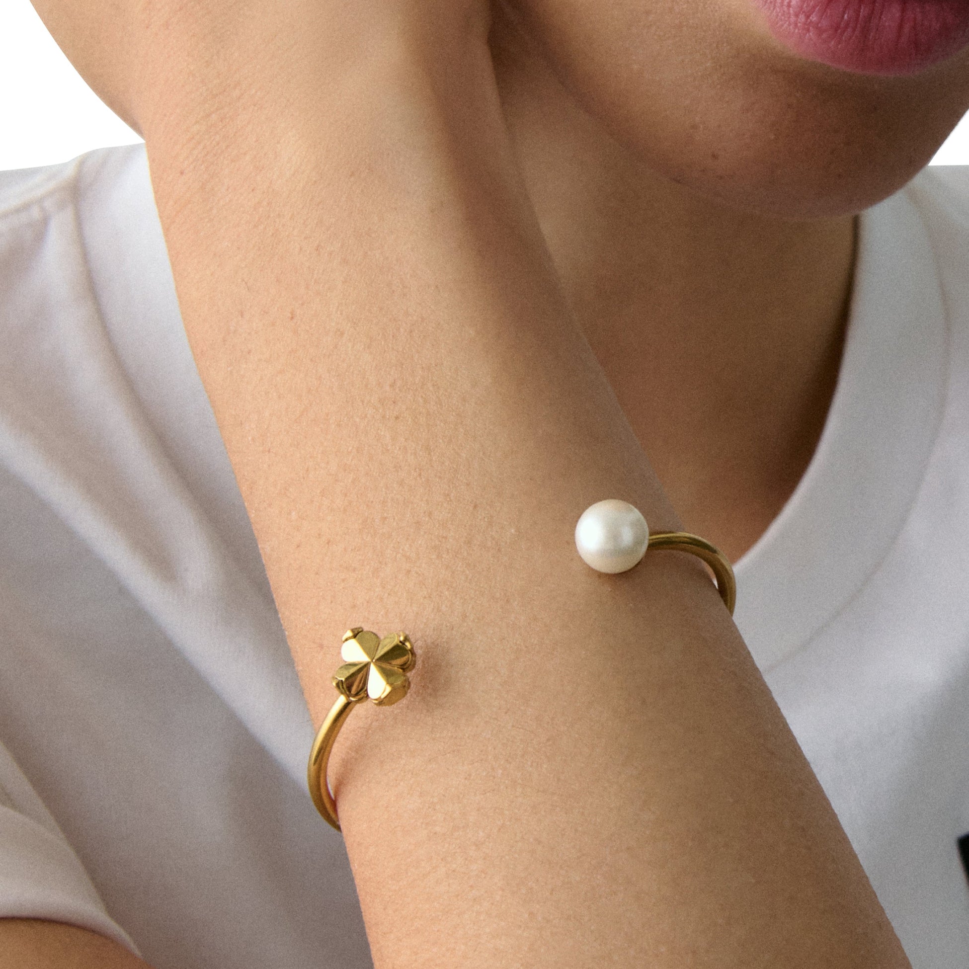 An open cuff with feminine flair. Featuring spade-flower ends with imitation pearl, it’s a charming way to elevate any outfit—solo or stacked.