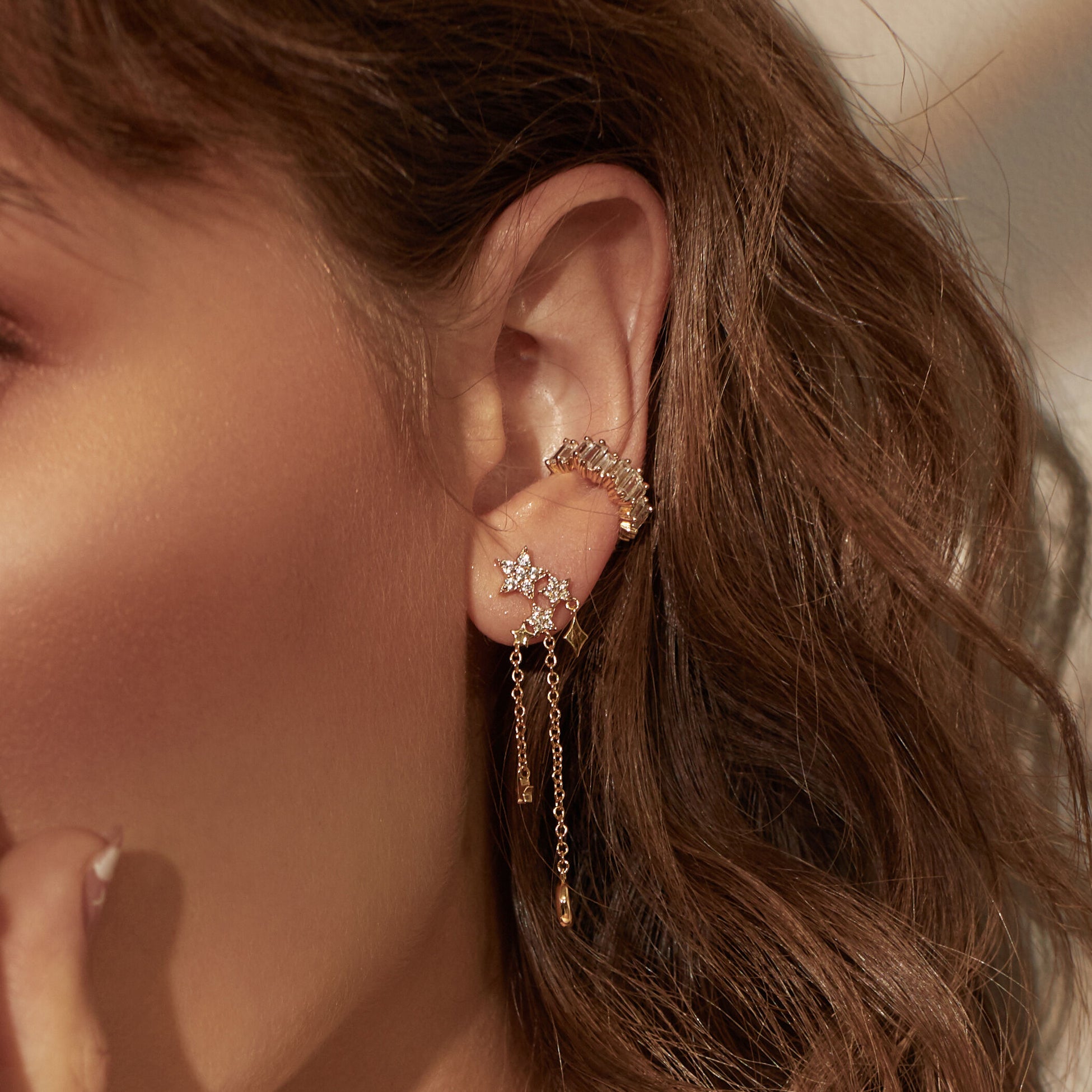 Inspired by a night full of stars, the Wish Upon The Stars Gold Drop Earrings features cubic zirconia stones in a pretty trio of stars on each side, with dangling charms in silhouettes of a crescent moon and star on one side.