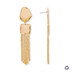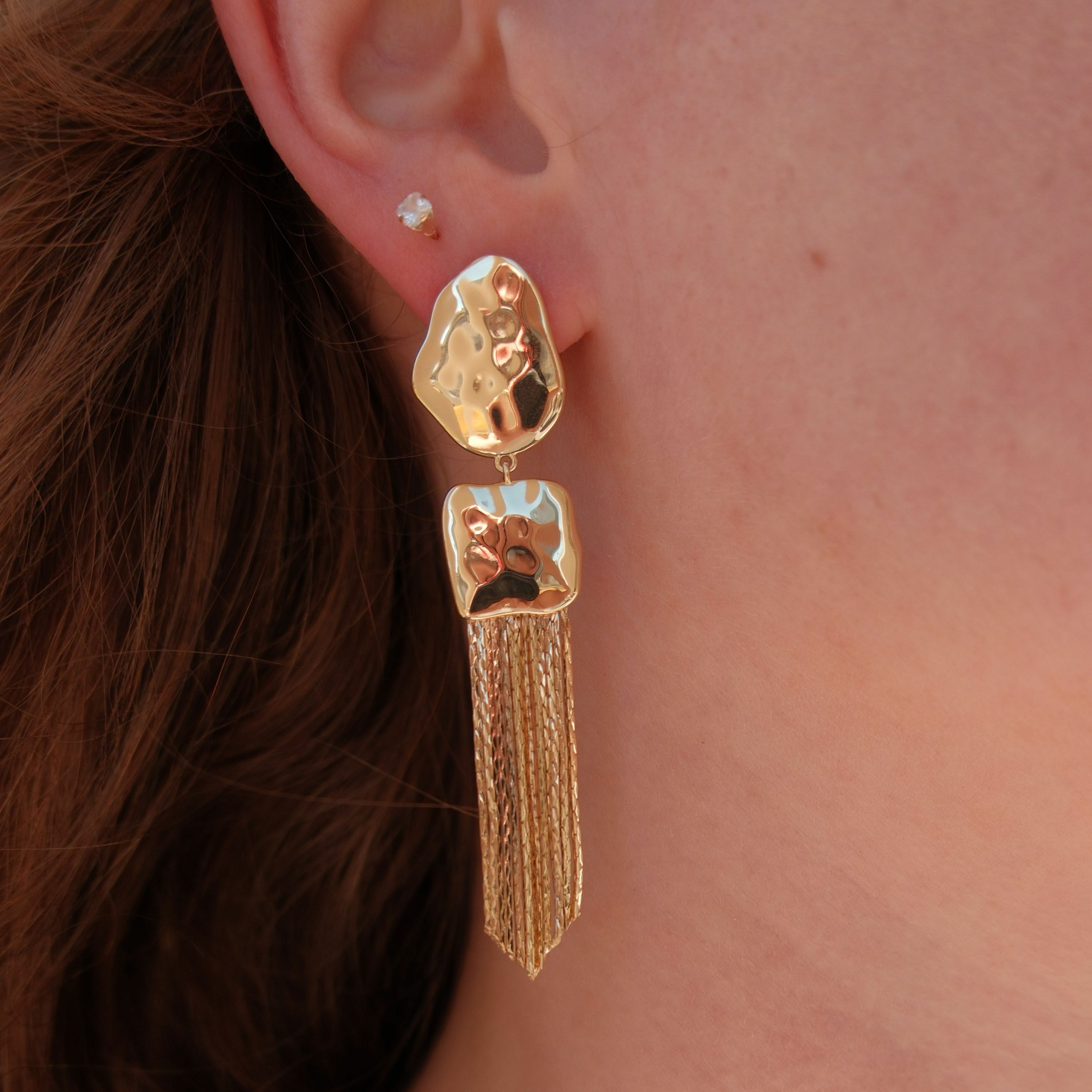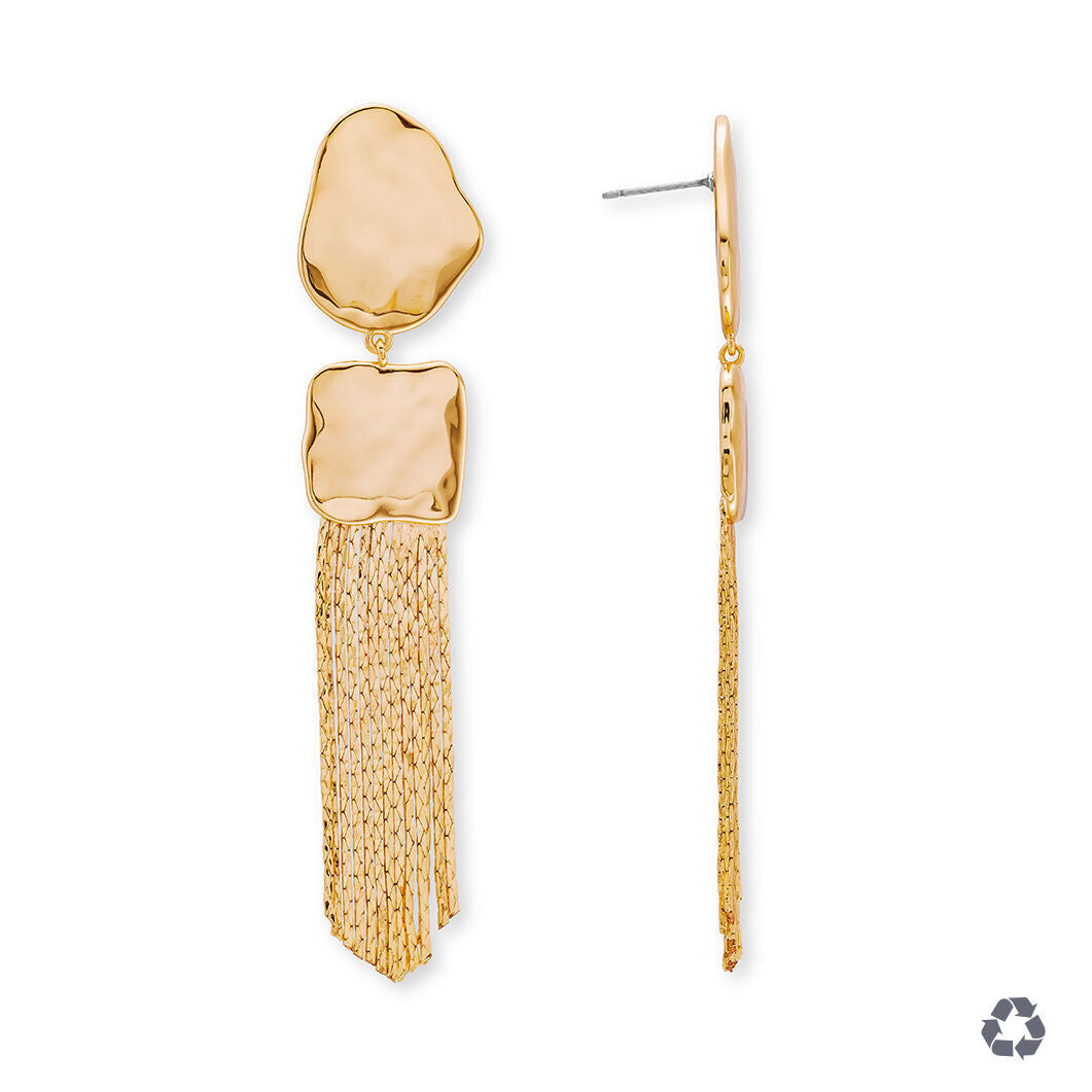 All Rocksbox Redefined styles are made with reclaimed materials! Swing into a boho-chic vibe with Rocksbox Redefined's Aspen Fringe Drops in Gold. These earrings are made of hammered, 14k gold-plating, and measure 3''. Made with reclaimed materials.