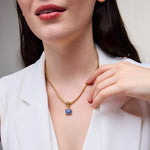 Glow with the flow in a blue line stone pendant that reflects nature’s brilliance. Set in 14k gold plating over recycled brass, this conscious style that makes a splash at work or weekend brunch. Flattering 16-inch chain extends up to 2 inches.