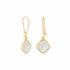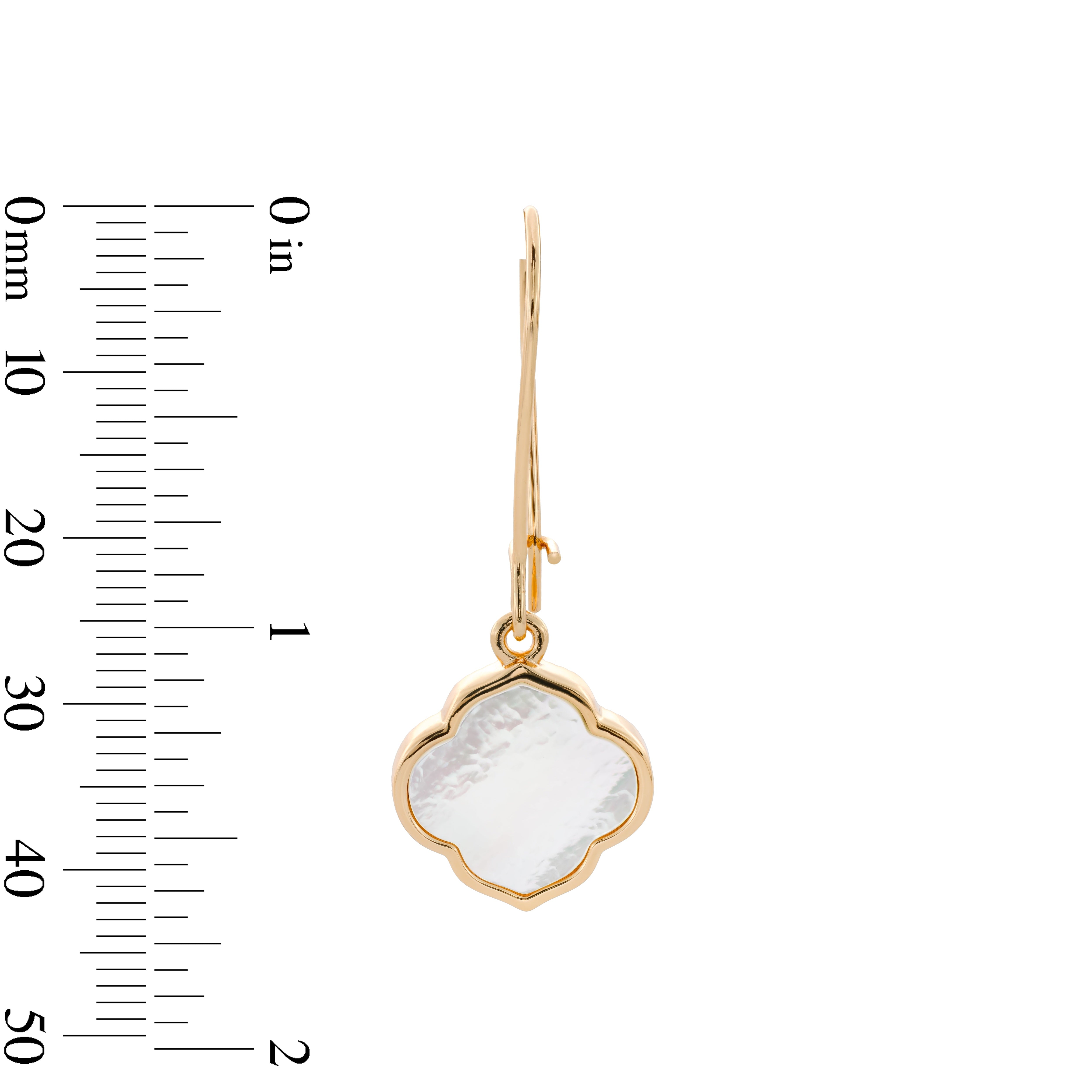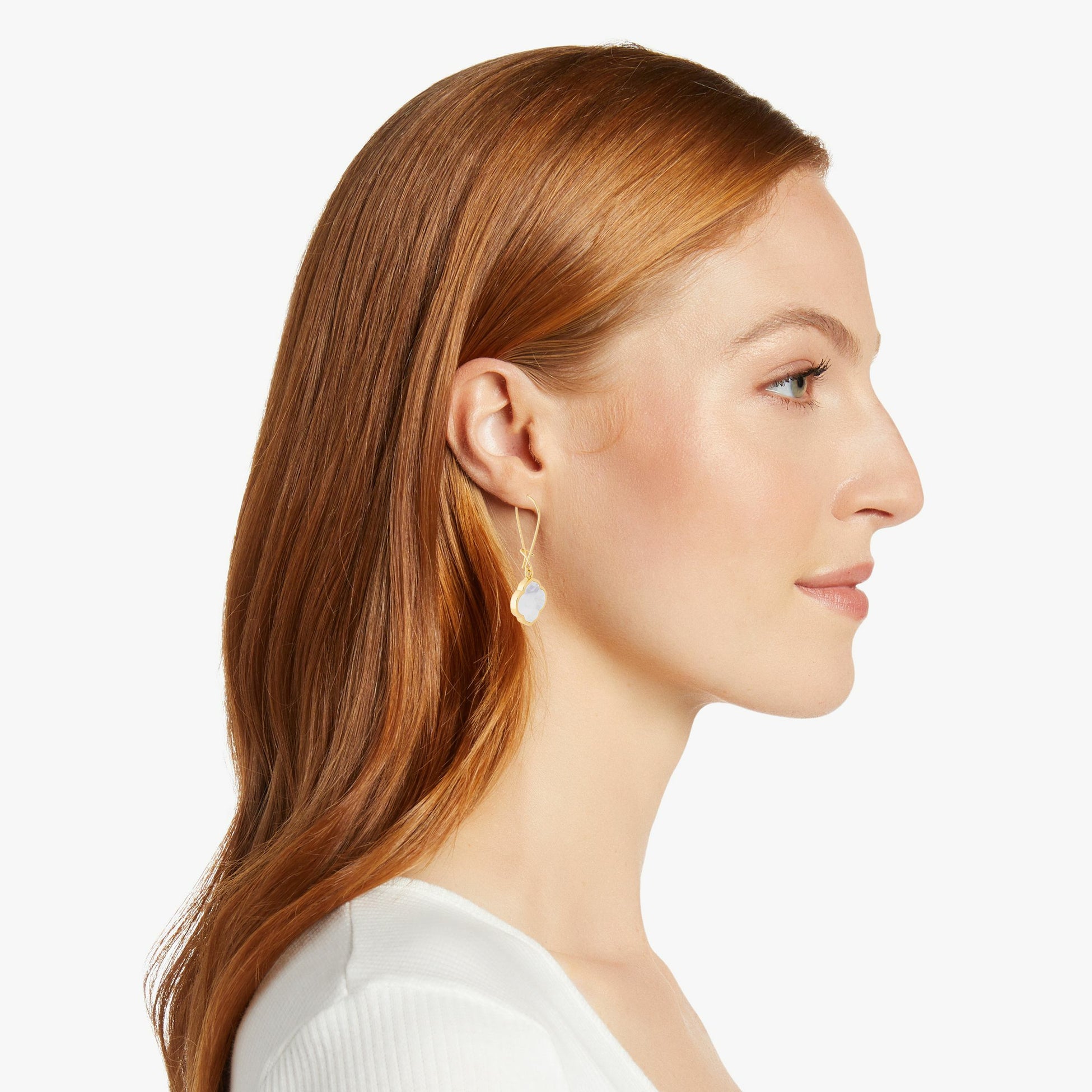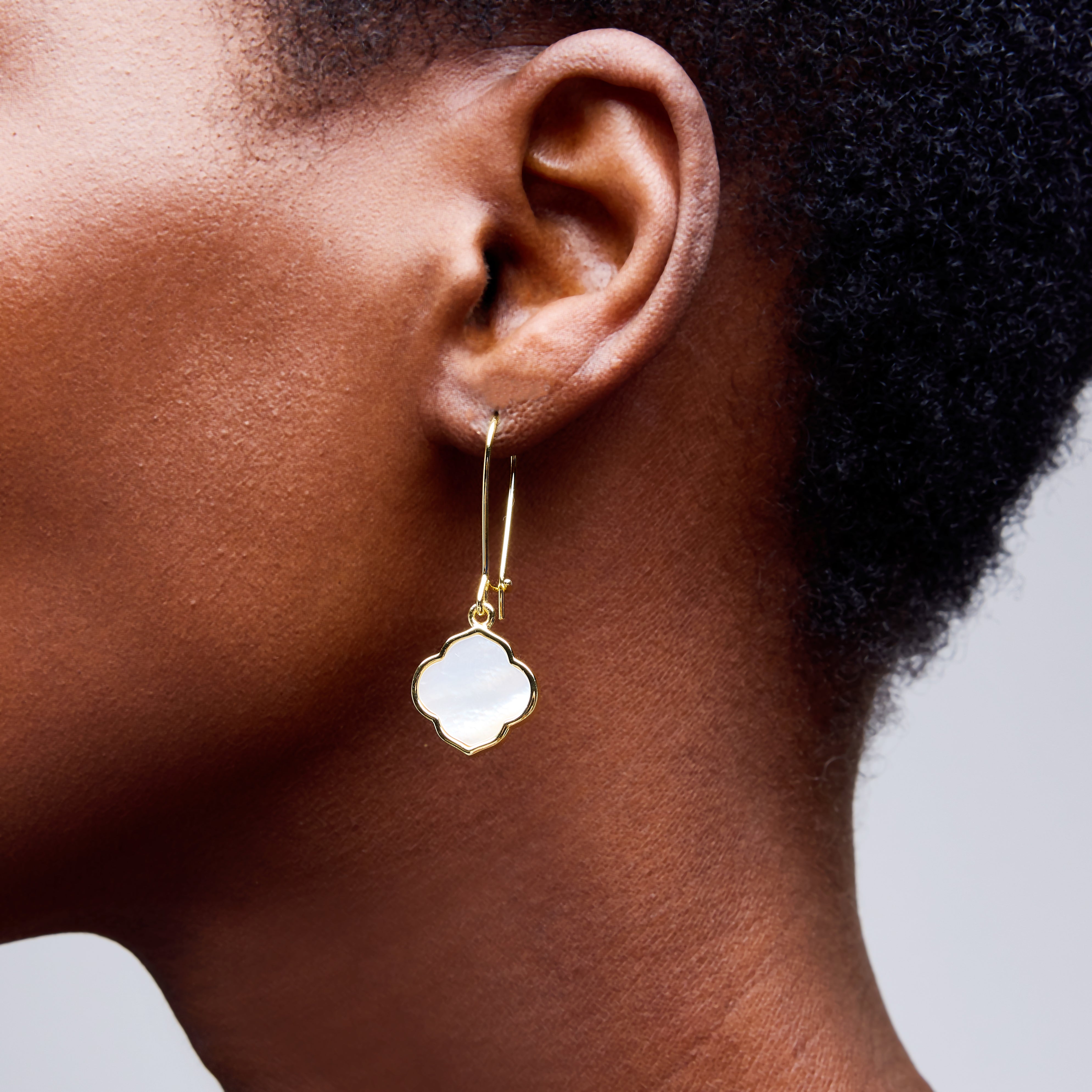 The Boston Drops in Gold & Mother of Pearl are earrings made of 14k gold-plating, measuring 1.75". These captivating earrings feature lustrous mother of pearl accents, beautifully framed.