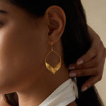 These elongated hoop drops bloom with a lotus-inspired silhouette that evokes effortless grace. Their fluid shape and 18k gold-plated finish make them a standout addition to any earring collection.
