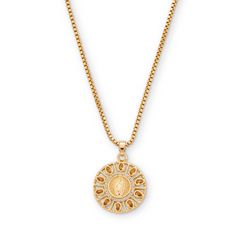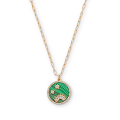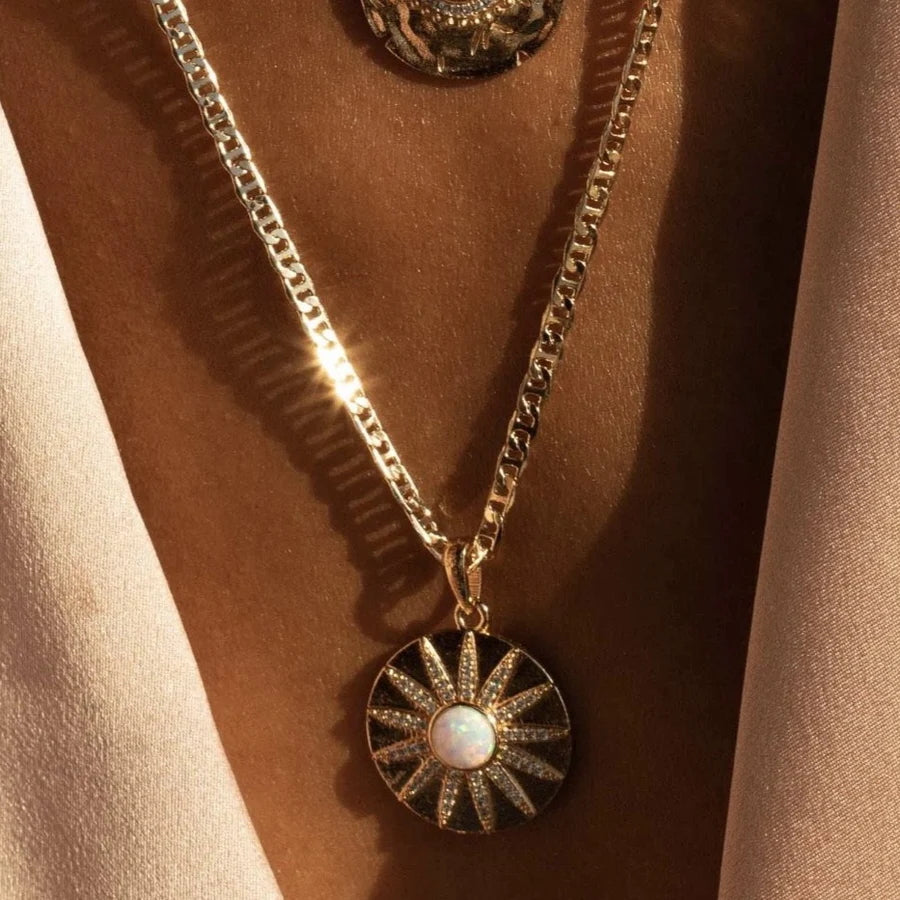 A dreamy pendant with celestial shimmer, this necklace catches the light with every move. The simulated opal center radiates soft iridescence, grounded by warm gold tones.