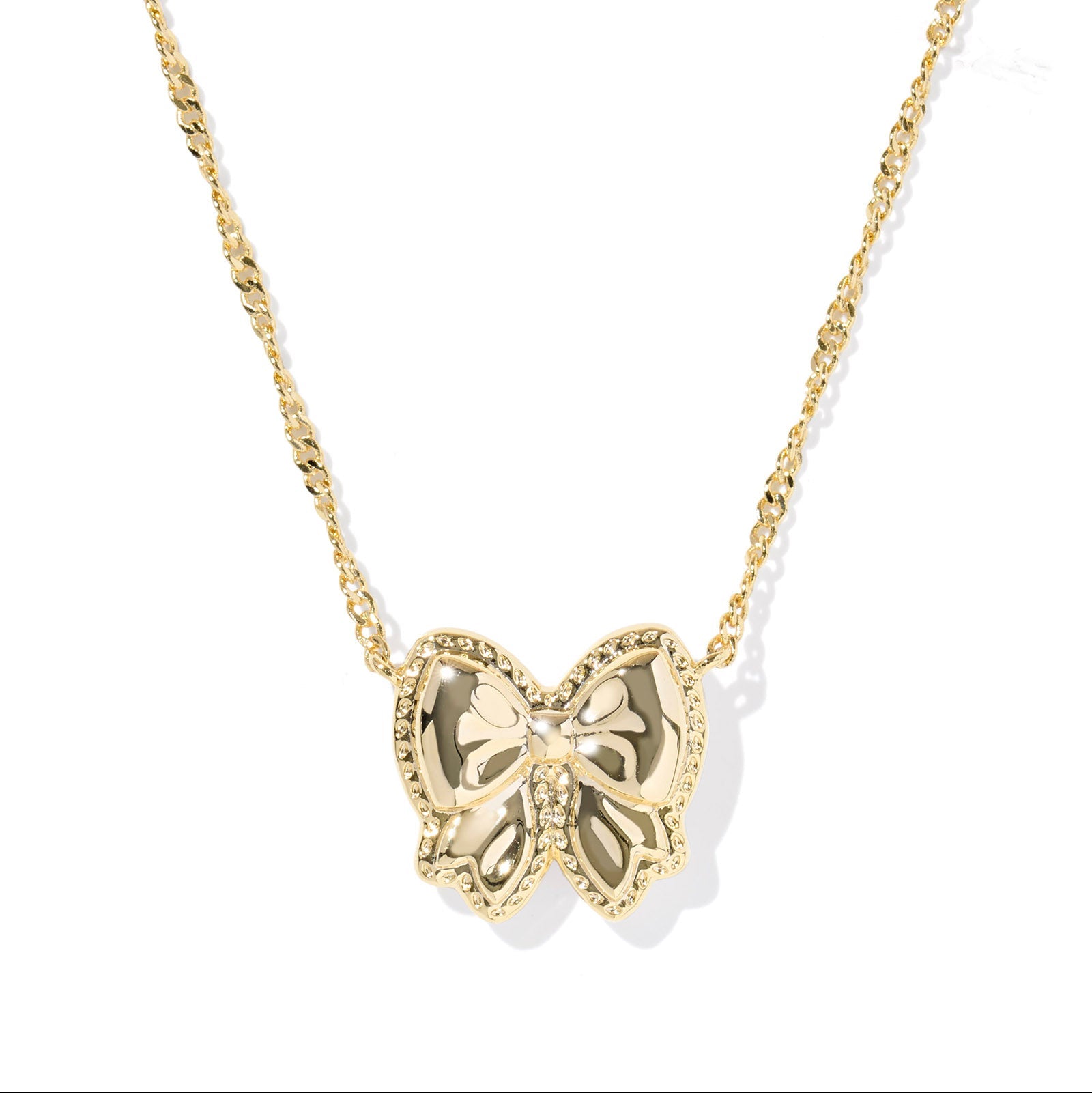 This sweet bow pendant combines classic femininity with a fresh feel, thanks to its ivory mother of pearl inlay. Finished in warm 14k gold plating, it’s a soft statement made for layering—or gifting with love.