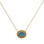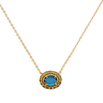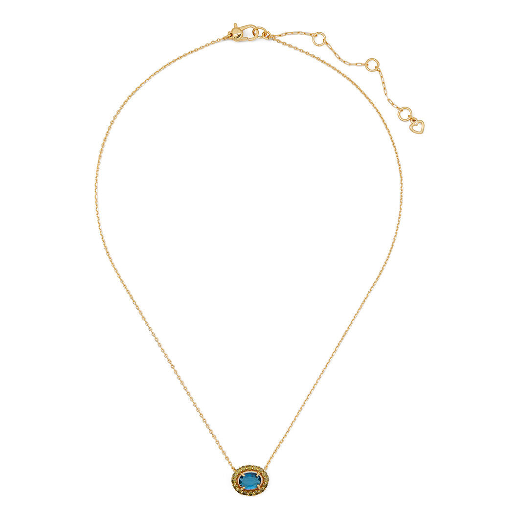 Dazzle day and night with the Victoria Mini Pendant in Blue & Gold by Kate Spade. This high-polish, 18k gold-plated necklace features a single blue pendant surrounded by smaller green CZ. Size 16" with 3" extender.