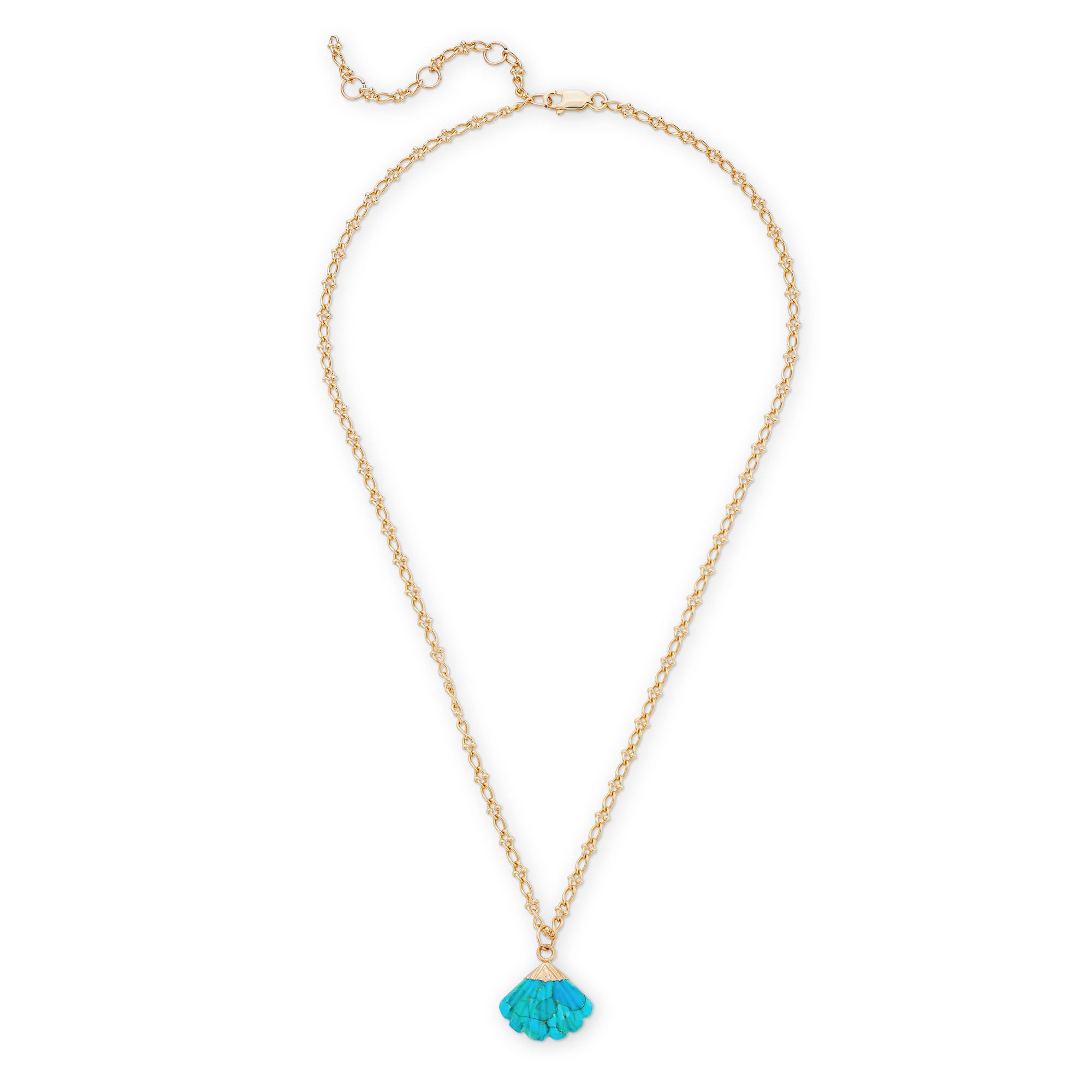 A sculptural shell pendant anchors this mixed-stone design, paired with a genuine turquoise charm. Finished in 14k gold-plated sterling silver, it’s a layered look in one—casual enough for daytime, polished enough for night.