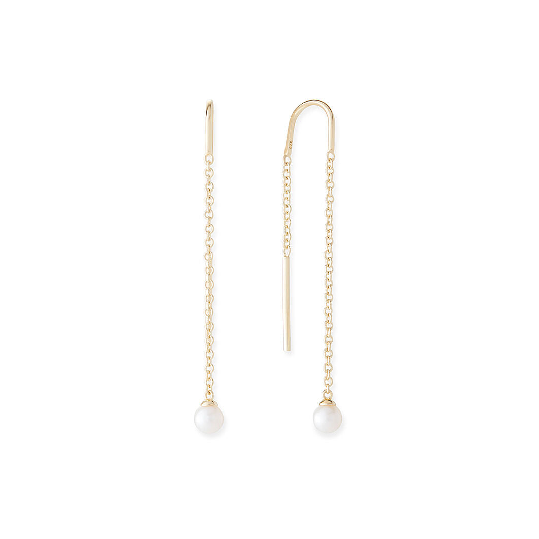 The 18k Gold Plated Pearl Threaders are drop earrings made of 18k gold-plating over sterling silver, measuring 1.5". Embrace elegance and grace with this timeless style, featuring lustrous mini cultured pearls.