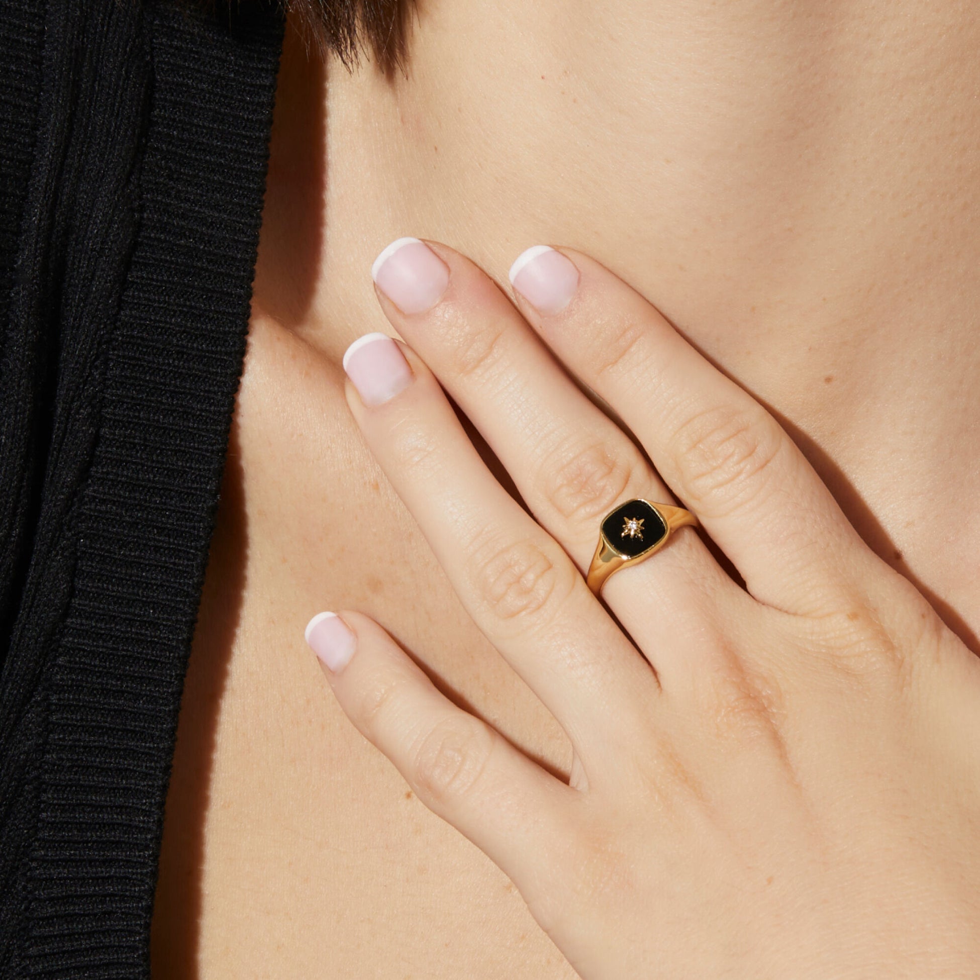 Ana Luisa made you this gold signet ring to amp up your seasonal wardrobe. This bold ring is dipped in 14K gold and features an onyx stone beneath a unique star symbol.