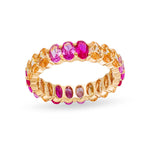 The Emily Ring in Pink Ombre is a 14K gold-plated stackable ring. Featuring oval CZ stones ranging from light to dark pink.