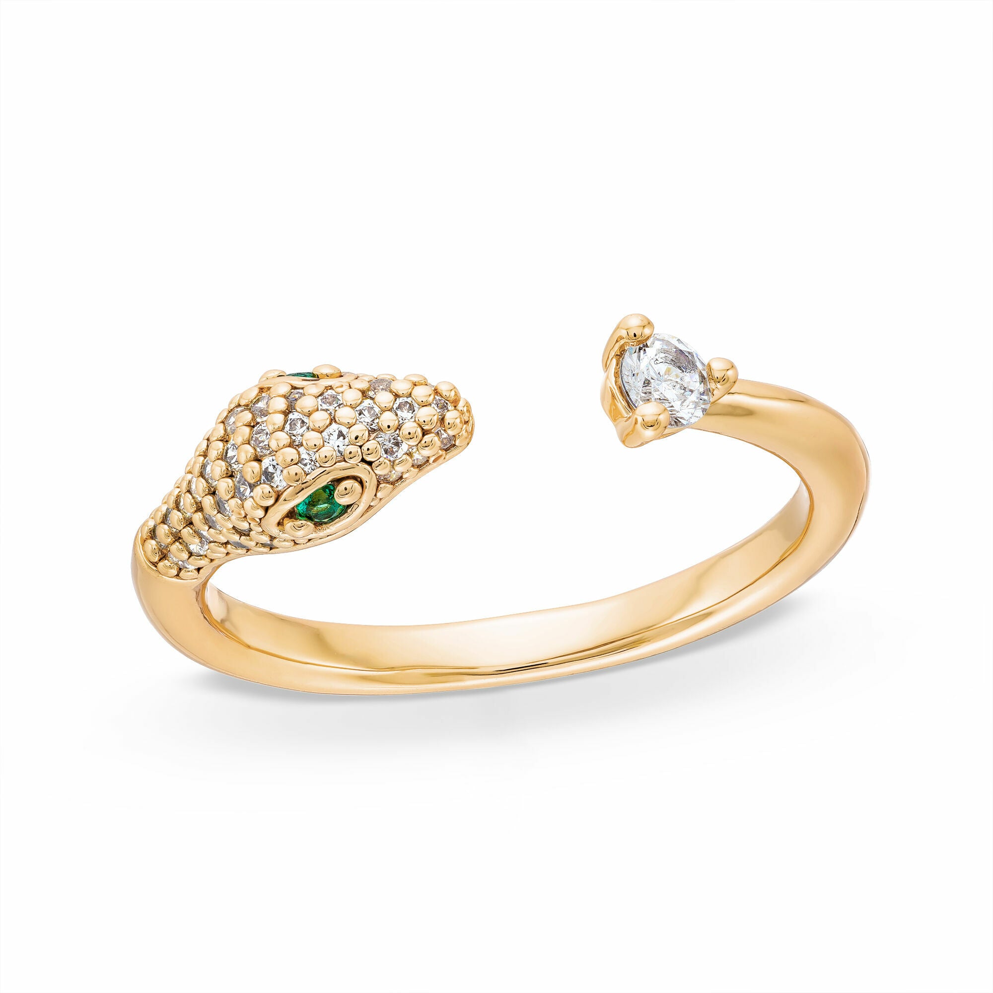 The Rocksbox Snake Wrap Ring in Gold & Pave features a snake design in clear and emerald green pave. Made with 14k gold plating and finished in high polish.