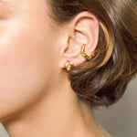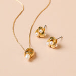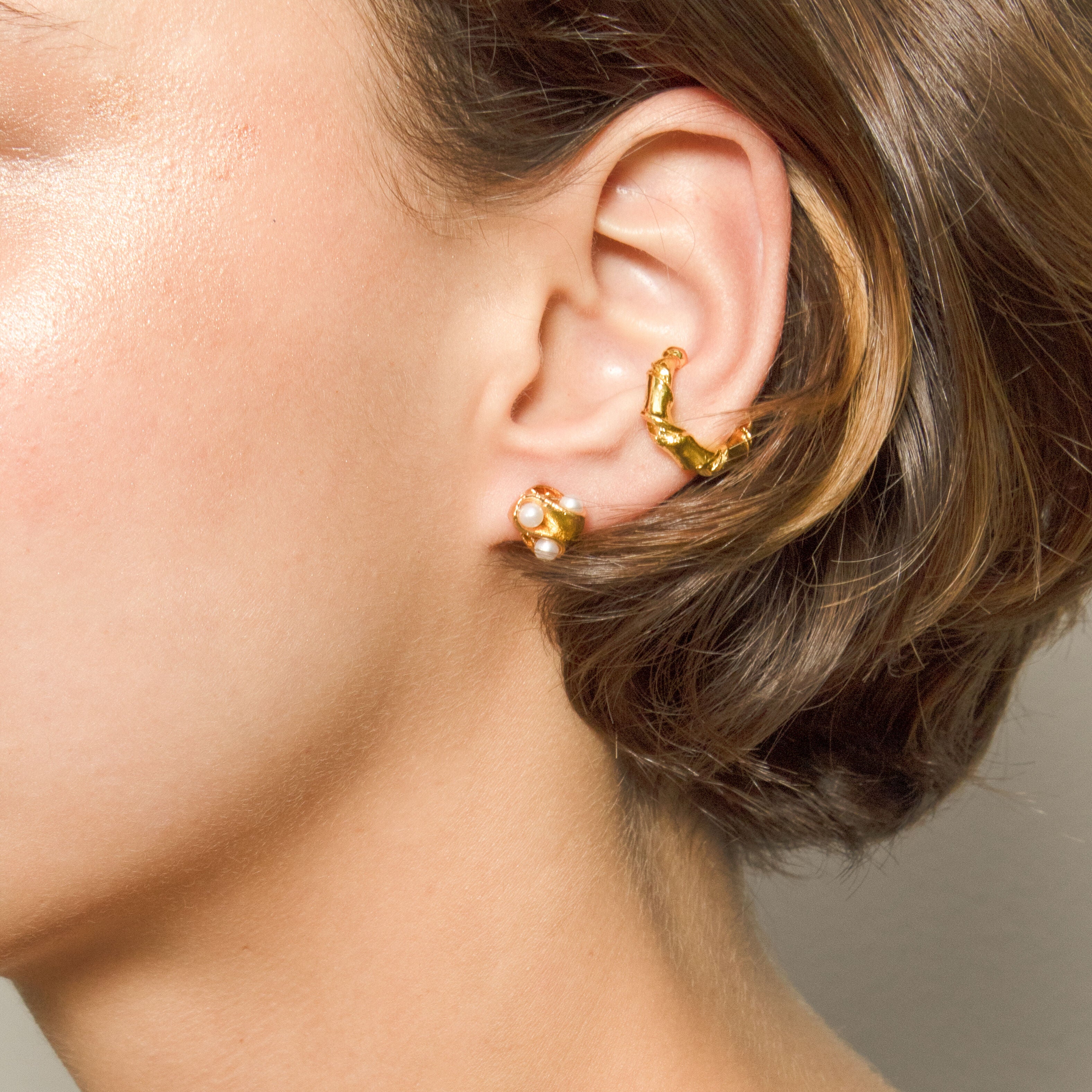 The Anfora Studs by Pajarolimon feature a delicate organic design with dainty pearls. Made with 24k gold plating over recycled bronze. Handcrafted by artisans in Columbia.