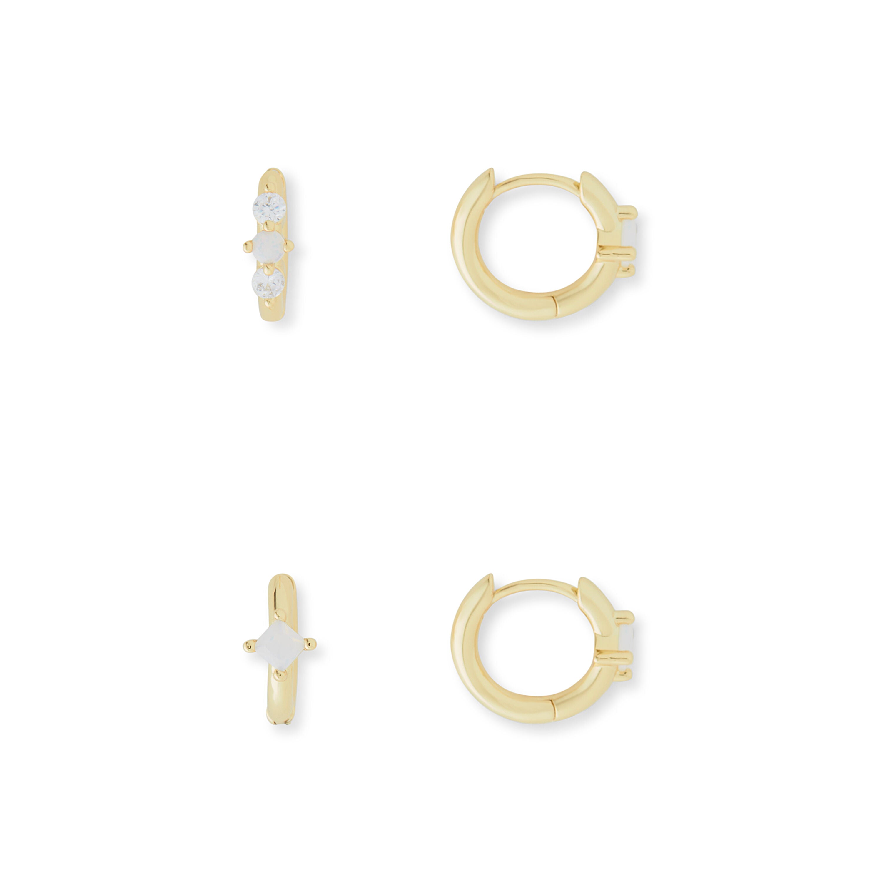 The Aura Opal Huggie Set by Rocksbox are a 14k gold plated huggie set accented with opal stones. 13mm in length. Made with stainless steel post backs.