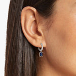 The Rockbox Baguette Drop Huggies are high polish silver plated earrings that are 0.20" long. The pave small hoop holds a baguette-cut charm in sapphire color.