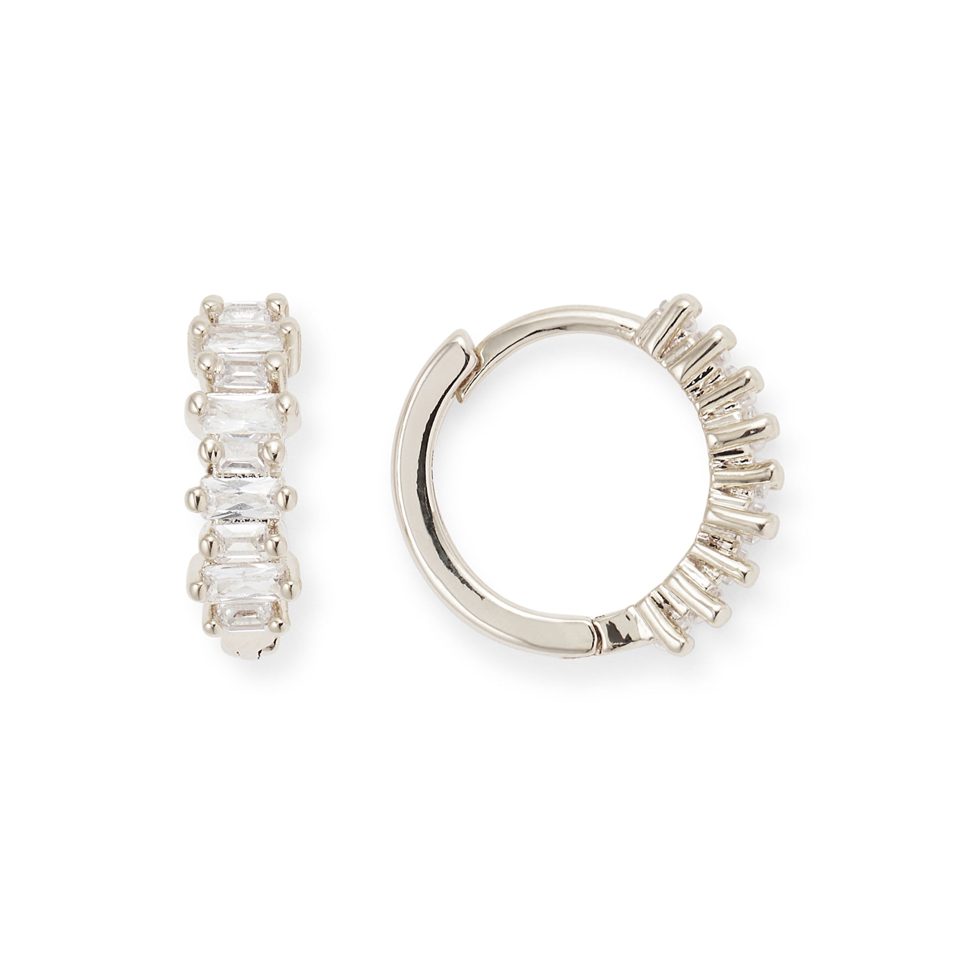 The Rocksbox Baguette Huggies are high polish silver earrings that are 0.12" long. These small circular huggies are covered by baguette-cut white crystals.