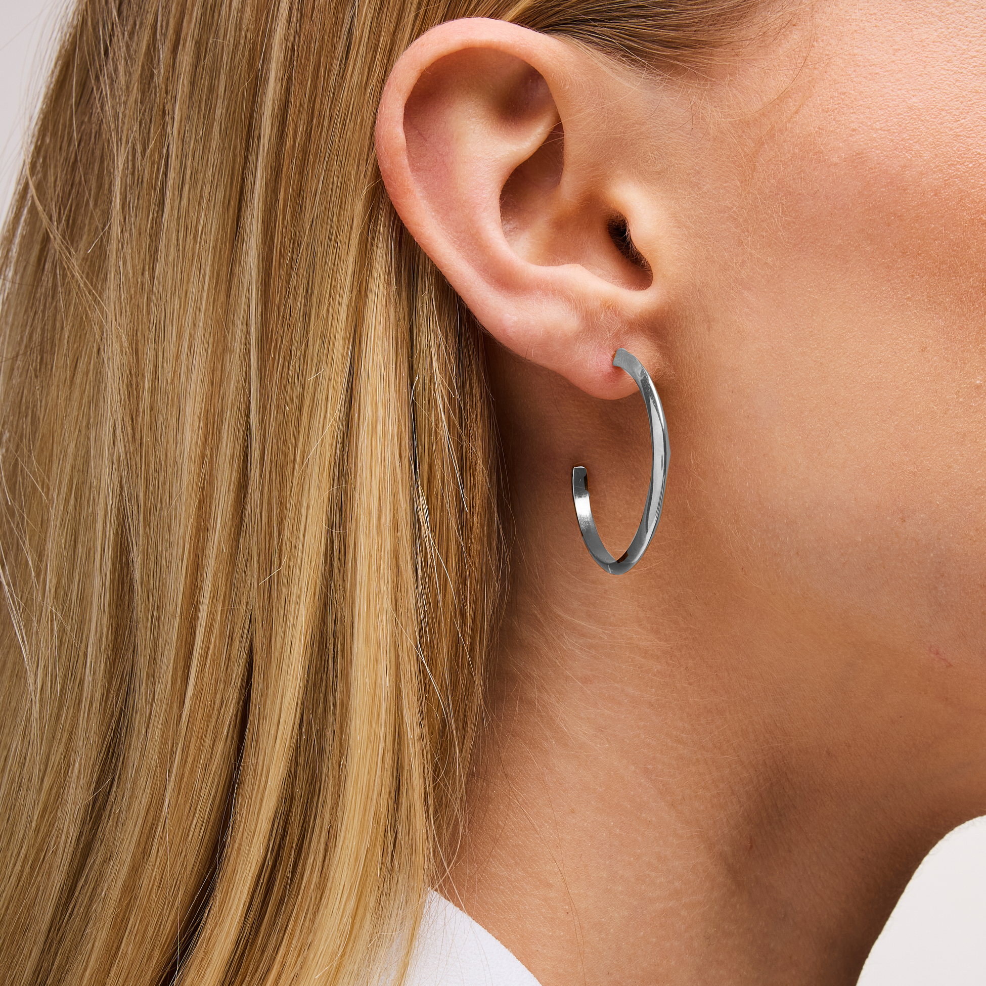 A cut above. These silver geometric hoops feature a knife-edge design for everyday style that’s far from ordinary.