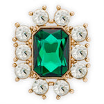 The Estelle Cocktail Ring in Green & Clear CZ is a statement, high polish ring featuring emerald glass and cubic zirconia in intricate detailing. Made with 14k gold plating.