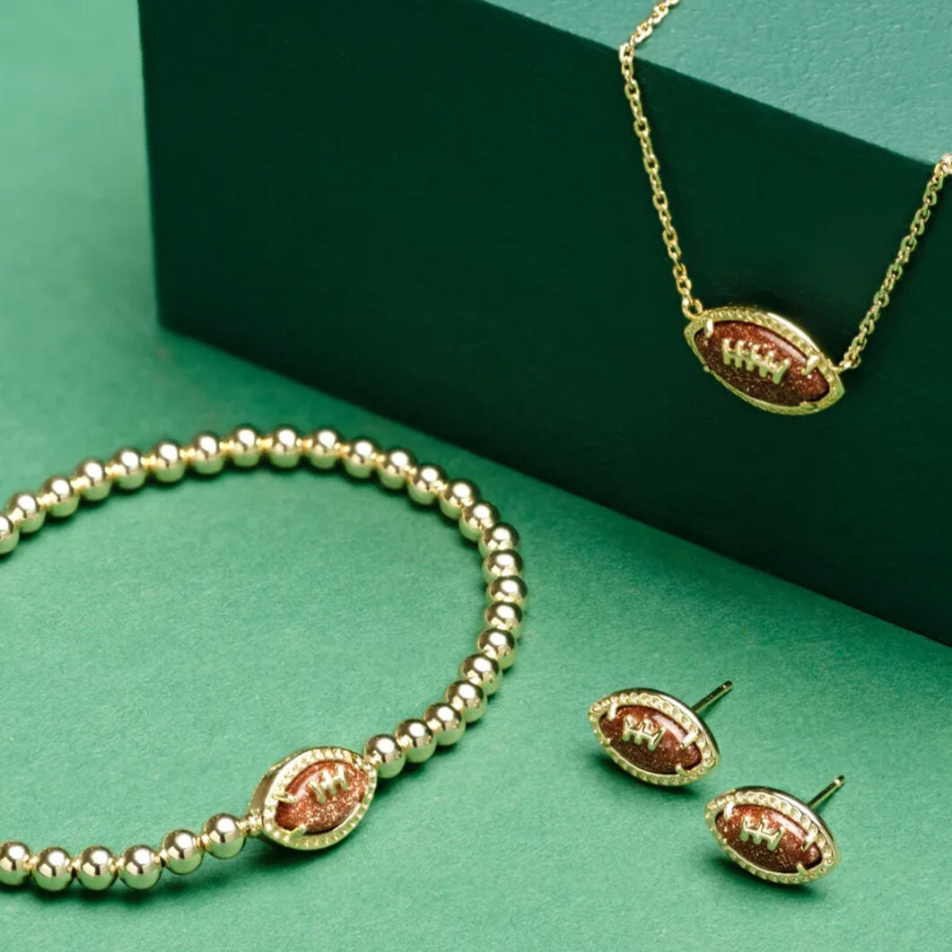 Our winning game plan? Styling the Football Gold Stretch Bracelet in Orange Goldstone all season long. A spirited football shape glitters in this beaded stretch bracelet style, adding a sporty touch to your gameday wrist stack. This style's bound to be a bestseller like the matching Football Short Pendant Necklace, so snag one fast!
