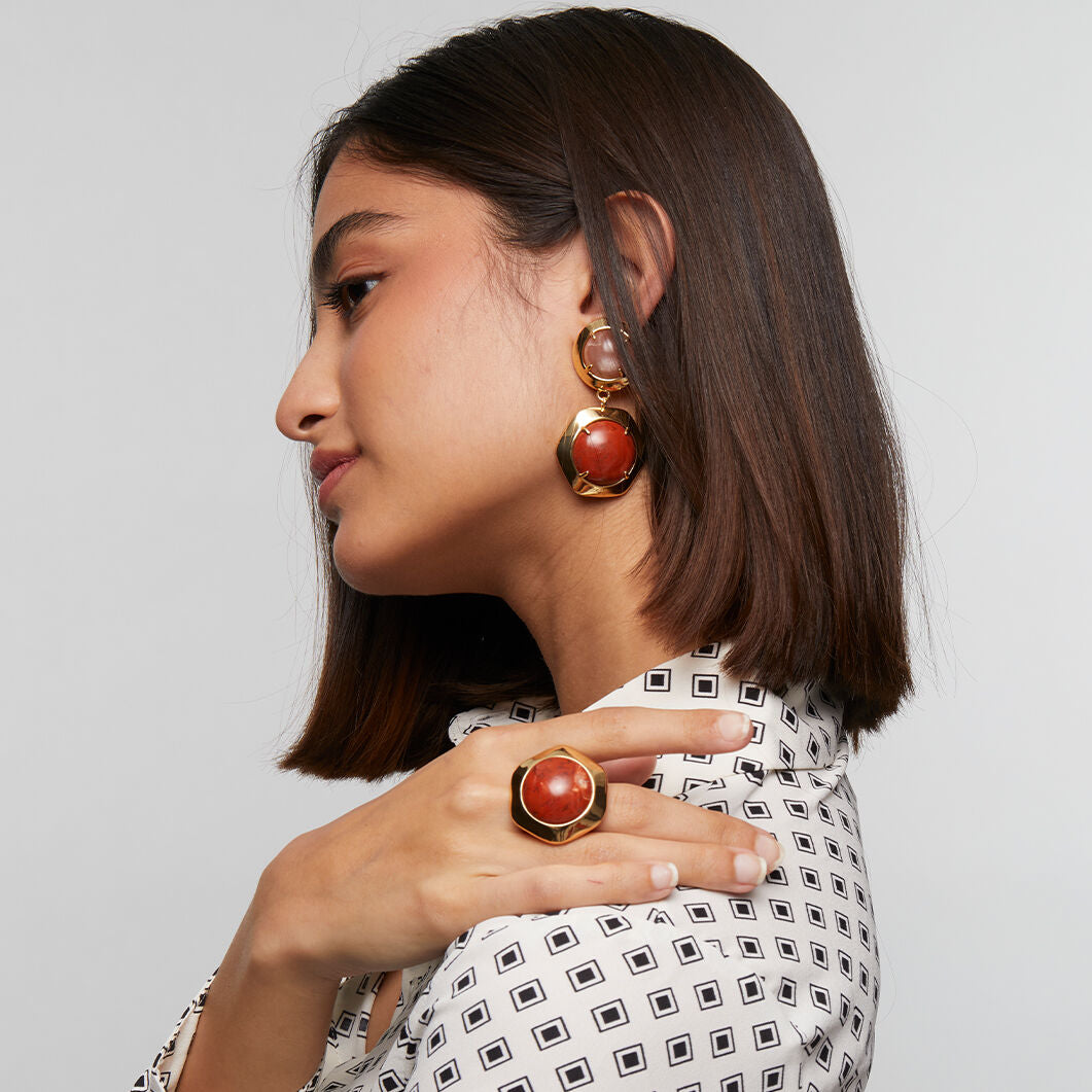 The Geo Bezel Cocktail Ring in Harvest by Lele Sadoughi will spice up an everyday or special occasion look. This ring features high polish, 14k gold-plating with a single, warm-toned crystal.
