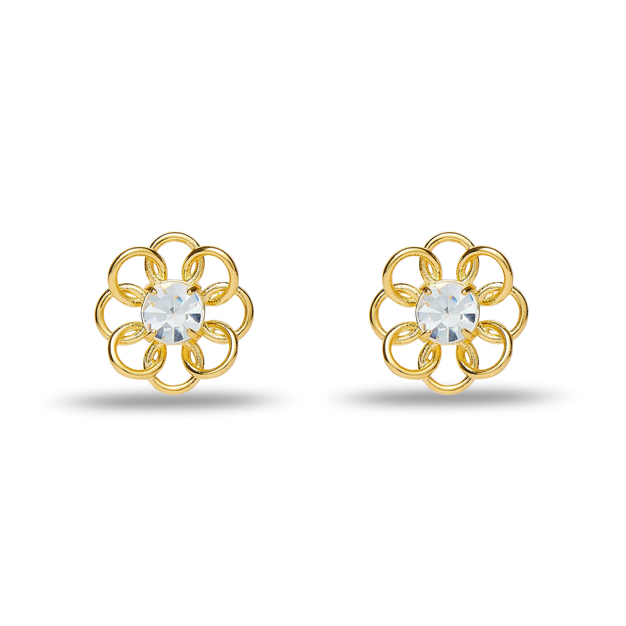 The Marigold Stud Earrings in Gold are 14k gold-plated, spiral-shaped flower petal earrings featuring large, clear stones in each earring's center and finished in high polish. Feel flirty and floral with these easy-to-style gold studs.