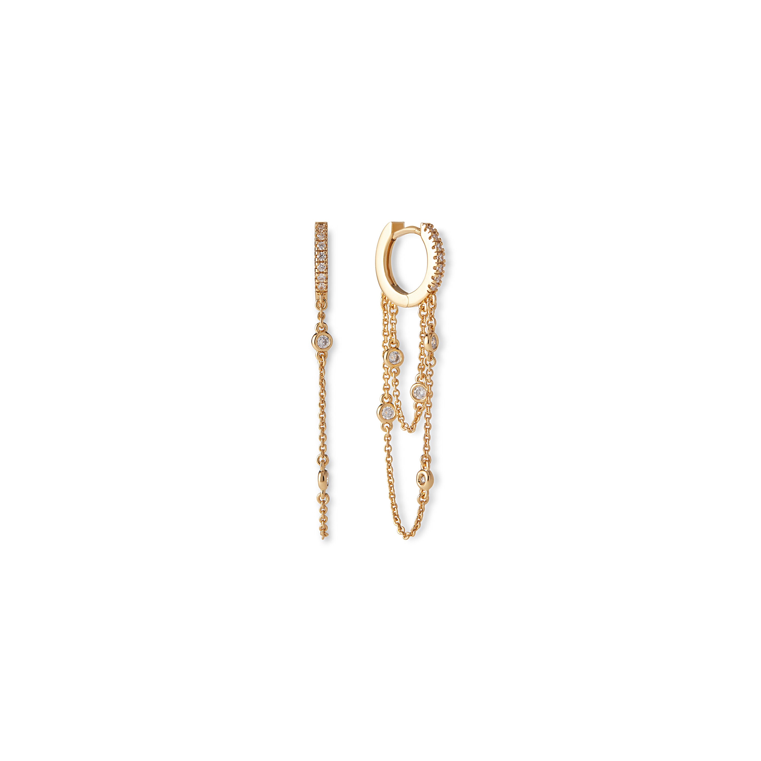 The Noe Chain Huggies by Rocksbox feature 14k gold plated huggie earrings with 2 small chains in differing lengths dangling from each huggie. Adorned with small gems. 1.25" length.
