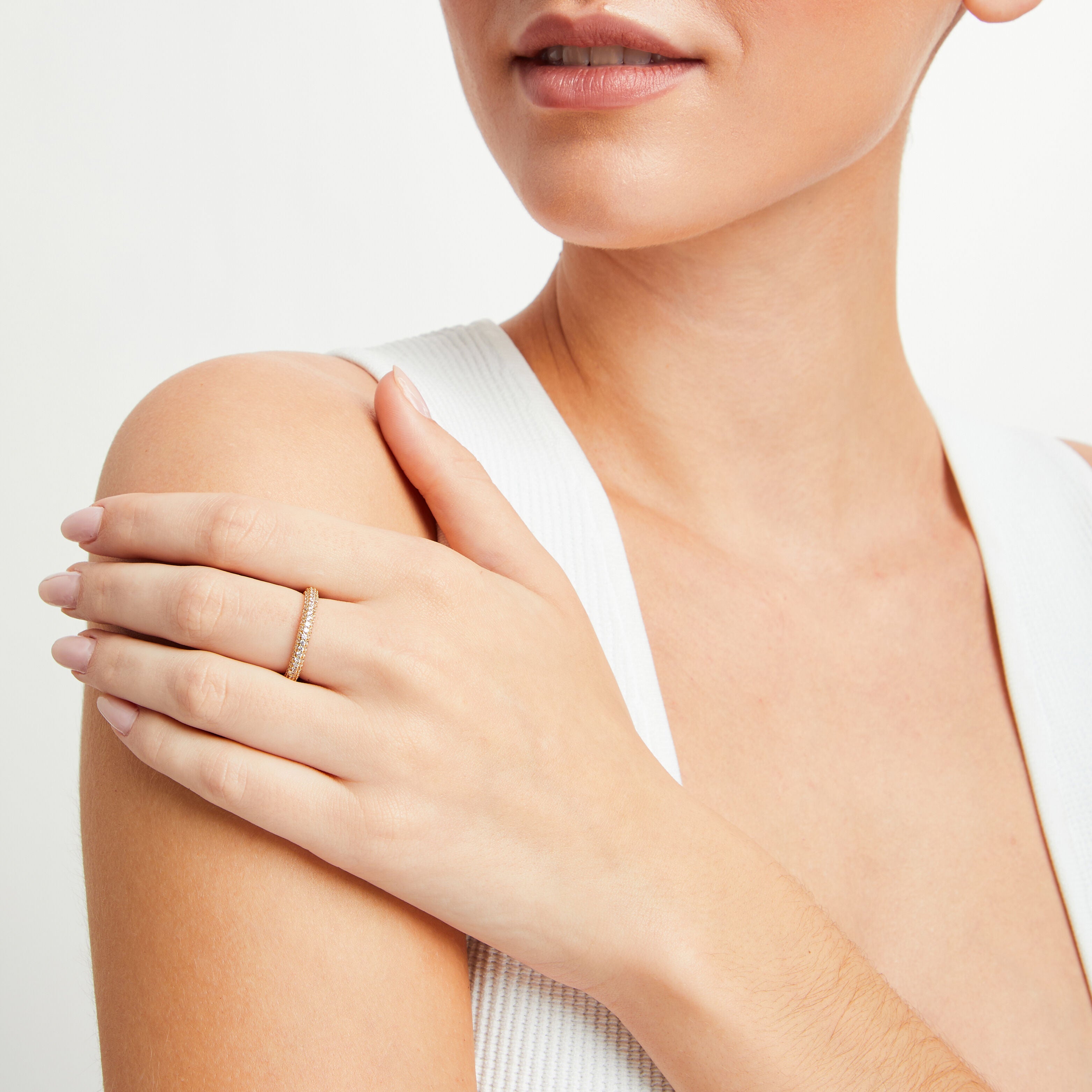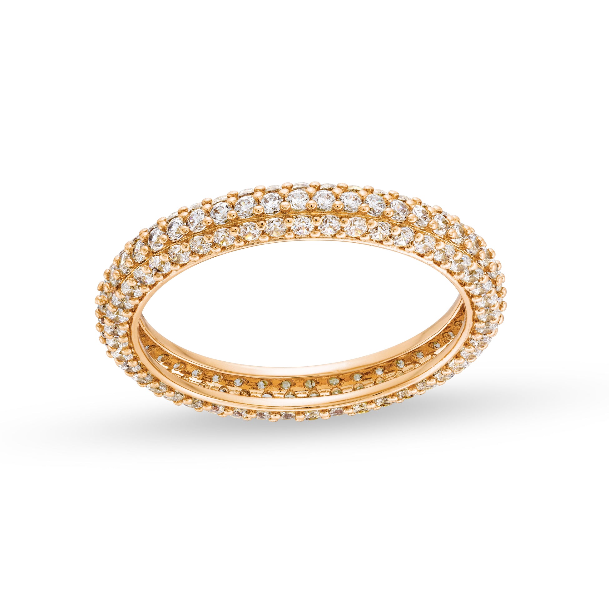 The Rocksbox Perry Ring is a 14k gold plated delicate ring. A circular band that is covered with small clear crystals.