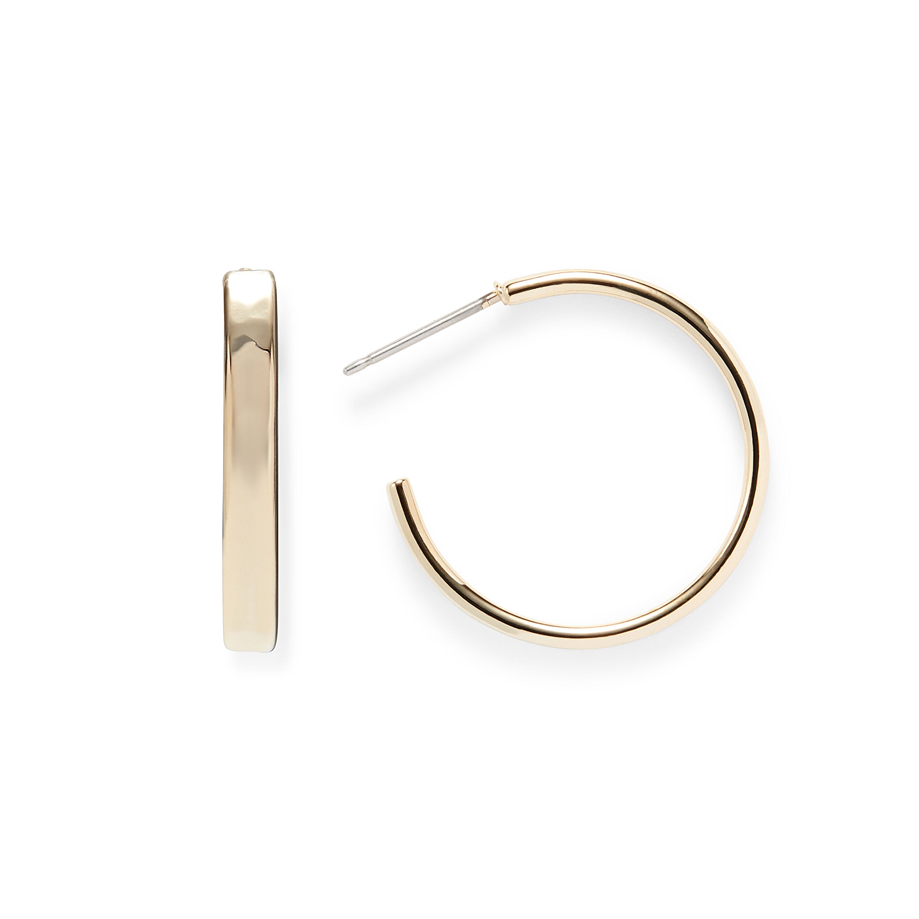 The Rocksbox Aster Petunia Hoops are gold plated hammered hoops that are 0.75" long