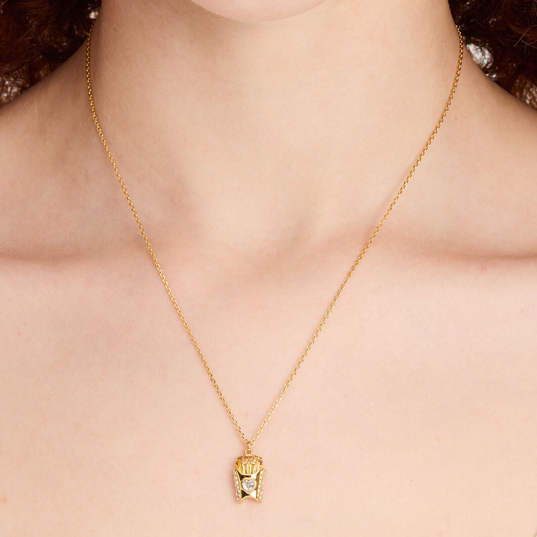 Showcasing a crystal-embellished french fry, this mini pendant is the chicest way to get your snack fix.